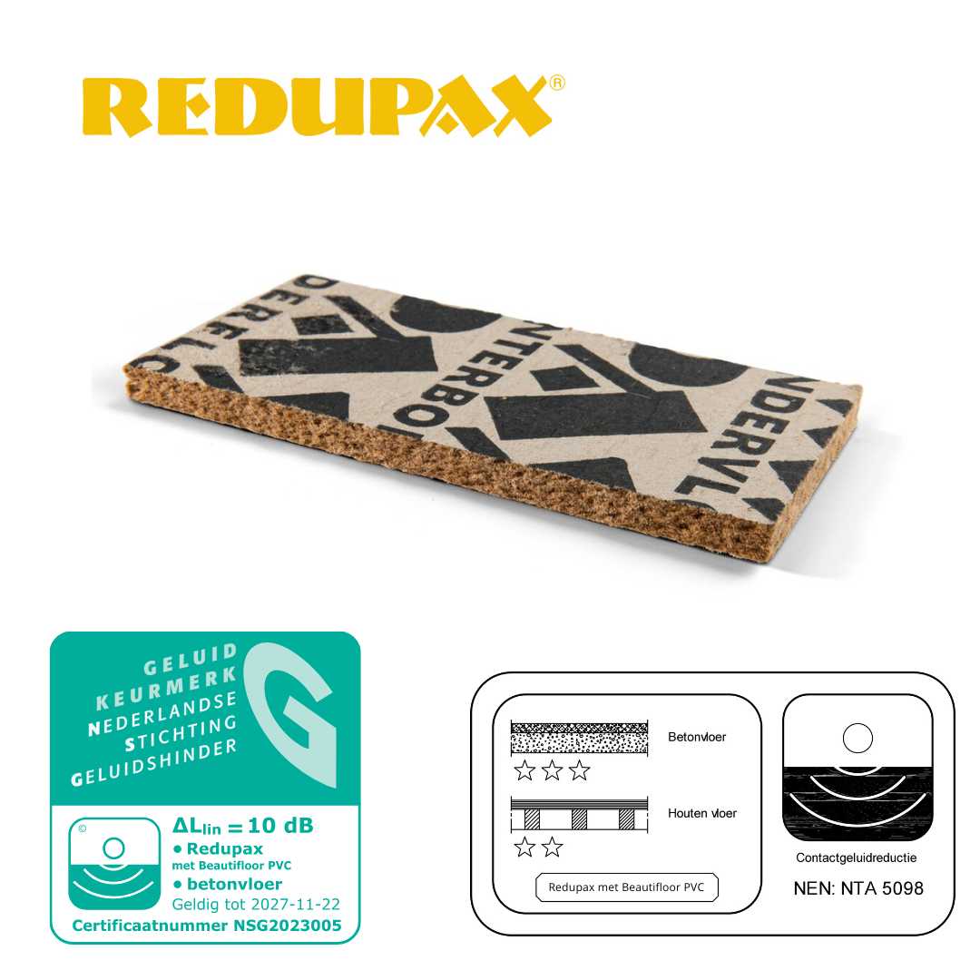 Deze FSC-label dragende ondervloer is geschikt voor zowel klik-PVC op HDF drager, laminaat als lamelparket. De 9mm dikke Redupax ondervloer zorgt voor een stabiel en veerkrachtig oppervlak dat de levensduur van je vloer verlengt. De Redupax ondervloer is gemaakt van zuiver natuurlijk resthout en is voorzien van een speciale VVP papier laag die ervoor zorgen dat de platen makkelijk te snijden zijn. Daarnaast draagt deze ondervloer het NSG-label voor PVC klik, kliklaminaat en lamelparket. De volledige certificaten zijn te vinden onder ‘Downloads’.